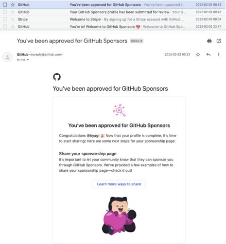大きな流れ Introduction (5,000 characters) と Short bio (250 characters) を書く(自己紹介と略歴) Sponsor tiers や Goals を決める($1/月で 10 人が目標、スポンサーになってくれた方への特典など) Github と連携する Stripe のアカウントを作成し、銀…